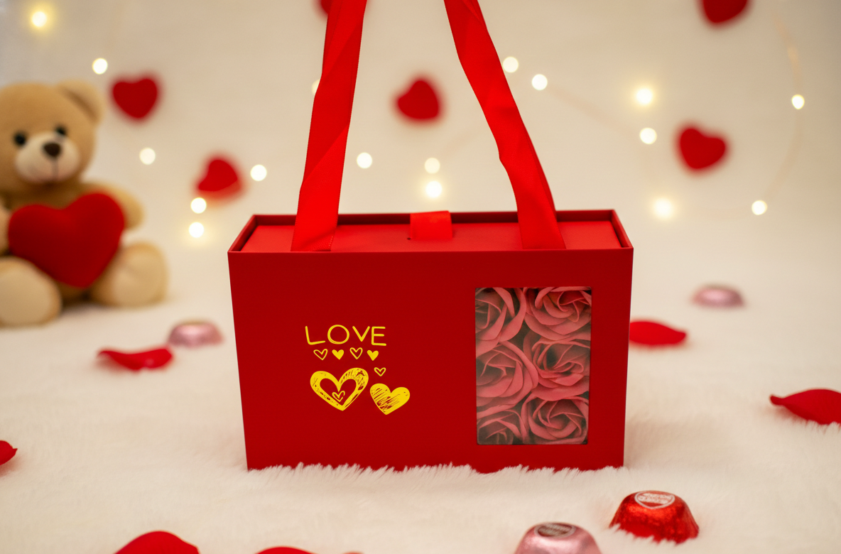 This Valentine’s Day, go beyond the ordinary with our Always yours Pendant box . Encased in a stunning, windowed crimson box, this hamper features a delicate arrangement of soap roses that never fade symbolizing a love that lasts forever.