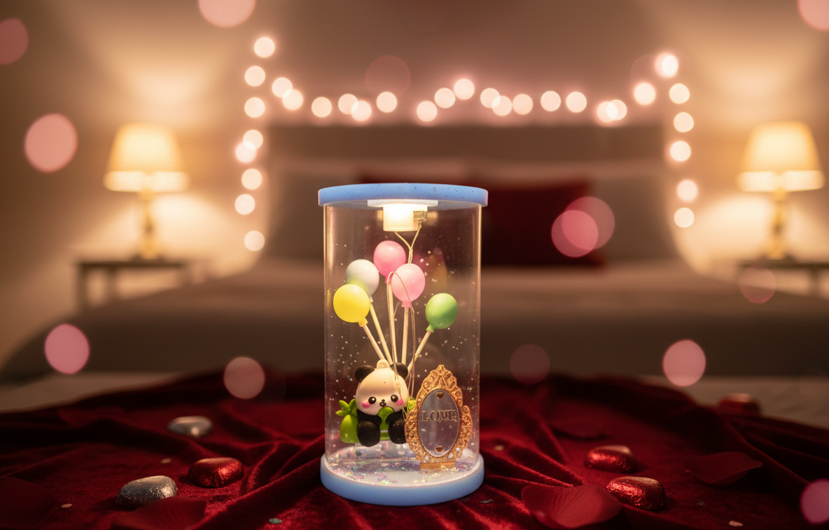 This adorable panda surrounded by floating balloons and a “LOVE” accent captures the magic of romance and celebration ideal for Valentine’s Day gifting